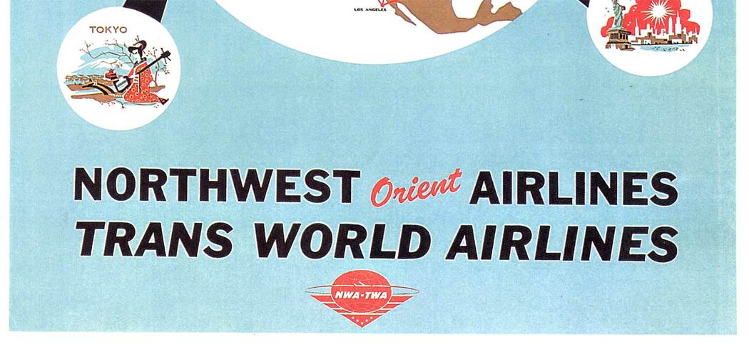 Northwest Orient & TWA Around the World Routes Poster, Global Aviation Map, Circa 1958, Linen Backed
