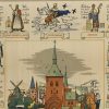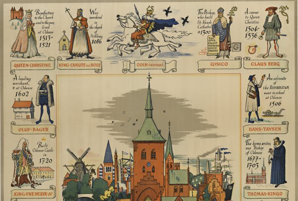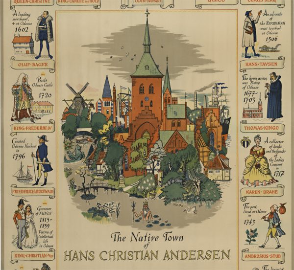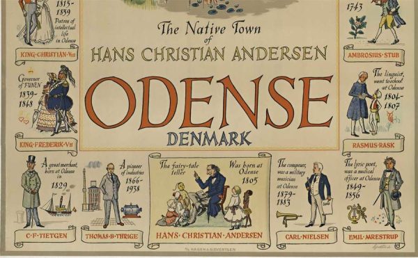Discover a charming original lithograph celebrating Odense, Denmark — “The Native Town of Hans Christian Andersen” — designed by Olle Hjortzberg and printed by A/S Hagen & Sievertsen. This linen‑backed travel poster features a detailed central view of historic Odense framed by a dozen small vignettes depicting Denmark’s royal, cultural, and folkloric figures.