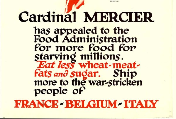The poster’s message highlights the importance of “saving food” for the war-stricken and presents Cardinal Mercier’s appeal to the public.