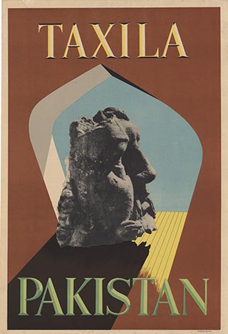 This Taxila (Pakistan) poster introduces the historic site through a focused, object-centered composition, isolating a sculptural fragment rather than surveying the broader landscape. The approach aligns with mid-century travel design strategies that foreground cultural artifacts as markers of place, allowing a single form to stand in for an entire historical continuum.