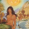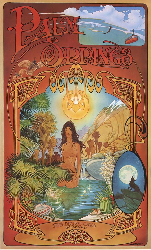 At the center of the composition, a mysterious semi‑nude figure emerges from a desert oasis, surrounded by lush palms, glowing water, and the dramatic mountains of the Coachella Valley. Ornate flowing lettering and radiant psychedelic forms frame the scene, giving the poster the dreamy, hypnotic style that defined the psychedelic art movement of the late 1960s.