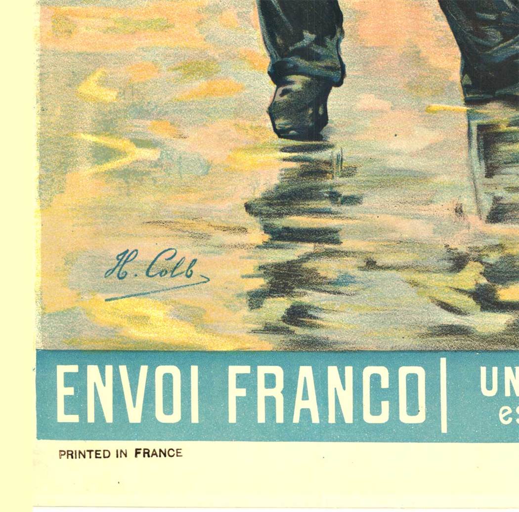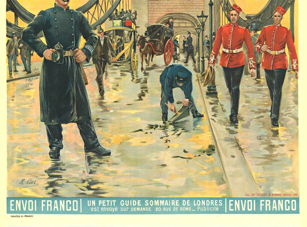 A rare and atmospheric early railway poster promoting travel from Paris to London via the Chemin de Fer de l’Ouest. The composition centers on Tower Bridge animated with period street life—uniformed figures, horse-drawn carriages, and even a street cleaner—captured with narrative richness uncommon in later travel advertising. Beyond its charm, the poster reflects the emerging connectivity between European capitals at the turn of the century, presenting rail and sea travel as both practical and cosmopolitan.