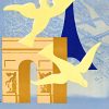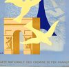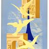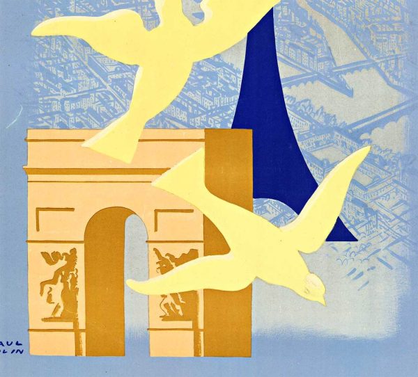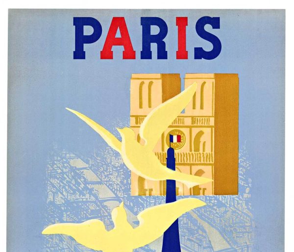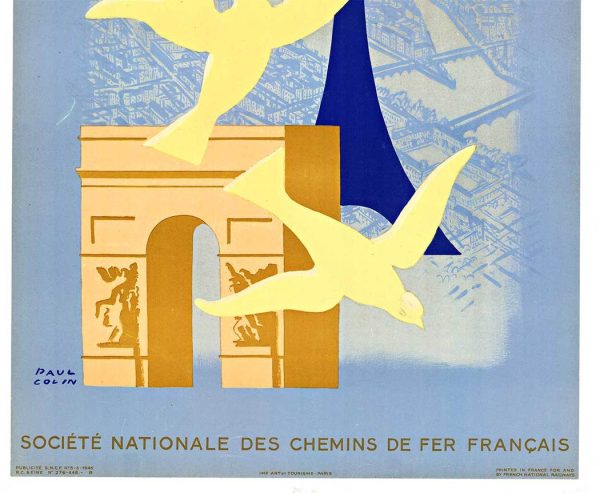A striking postwar Paris travel poster by Paul Colin, created in 1946 for the French National Railways. The composition layers the city’s most recognizable monuments—the Eiffel Tower, Notre-Dame, and the Arc de Triomphe—into a unified, almost architectural collage, animated by sweeping white doves in the foreground. Beyond its graphic clarity, the image carries a quiet symbolic weight, presenting Paris as a restored cultural capital and a beacon of peace in the immediate aftermath of World War II.