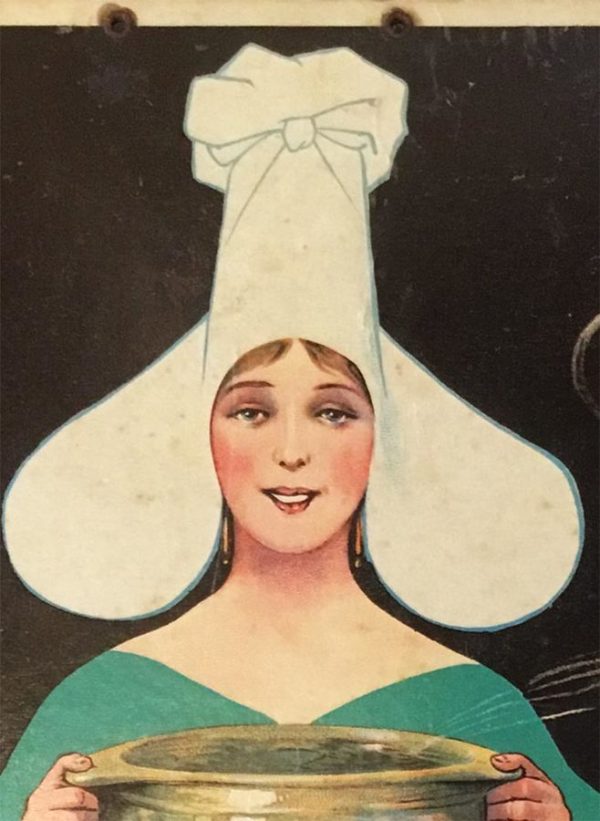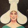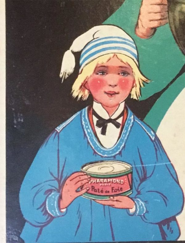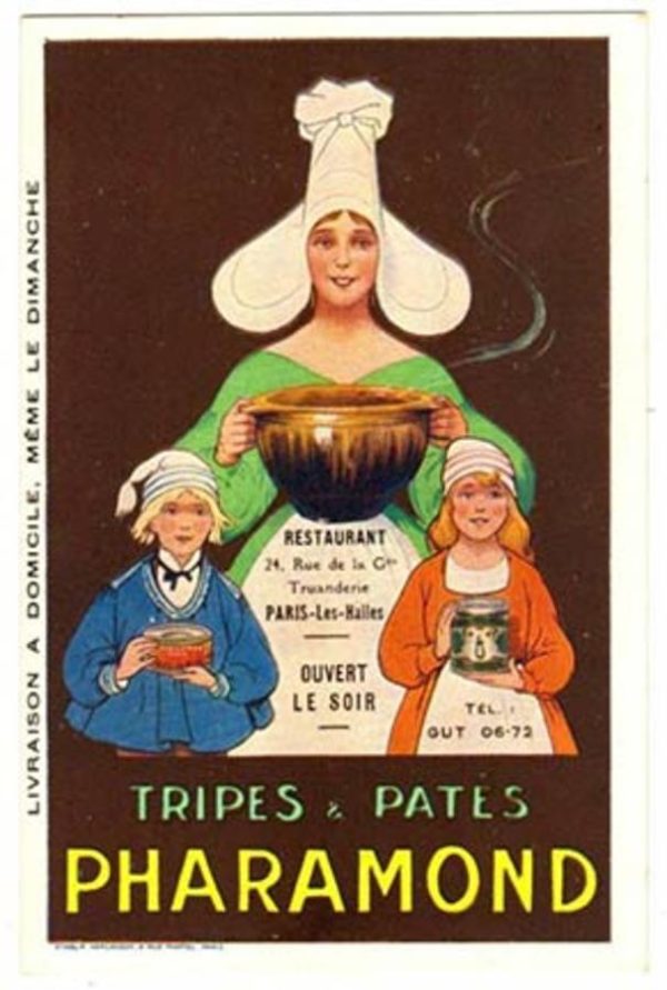Descend into the Belle Époque grandeur of Parisian gastronomy with this theatrical oddity: an original Pharamond Tripes & Pates cartone—a rare artifact of turn-of-the-century restaurant advertising that hung in the storefronts and dining rooms of Paris’s most storied food markets. Dating to circa 1930, this lithograph captures the playful absurdism of French culinary marketing at its apex: a towering, androgynous figure with an impossibly tall headdress holds an enormous golden bowl aloft, while two rosy-cheeked children below clutch smaller bowls in reverent wonder. The composition reads as pure theater—a culinary fantasy made manifest in cardboard and lithographic ink.