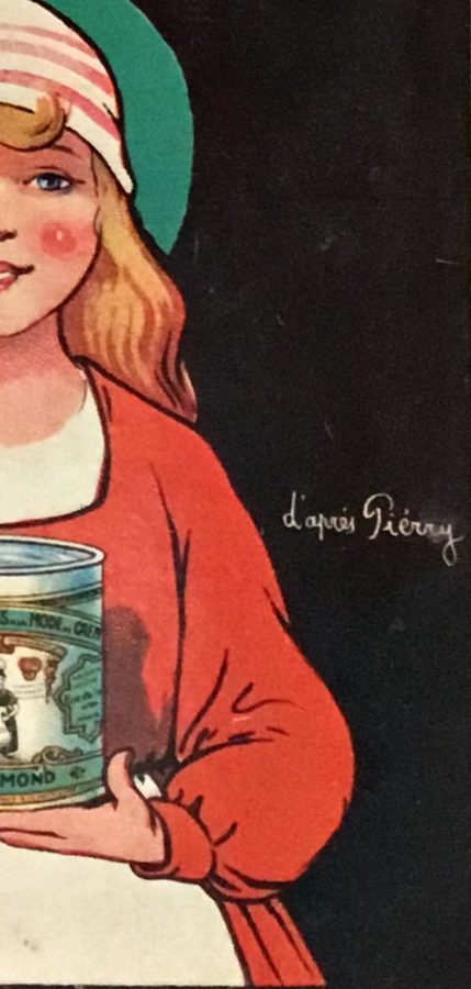 What makes this piece truly rare is its original cartone format—a thin cardboard backing that allowed smaller promotional lithographs to be hung from string inside restaurants, butcher shops, and market stalls for extended display periods. Unlike posters designed for temporary pasting, cartones were built to endure, their sturdy backing absorbing the grease, smoke, and chaos of working kitchens and market floors. They survive in far fewer numbers than their flat-poster cousins; this example, with its authentic period imperfections and gently worn corners, bears the honorable patina of genuine commercial use—a window into the material world of 20th-century Parisian food commerce.