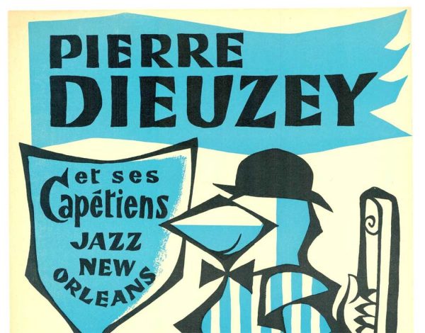 The poster depicts Pierre Dieuzey et ses Capetiens (and his six Captains), a French jazz group, in costume and holding musical instruments—most notably a trumpet. Visually, the composition centers on a figure dressed for performance, framed by decorative graphic elements and bold color fields. The main colors are medium blue and black, set against an unbleached, cream-toned paper ground, giving the poster a warm, vintage presence while remaining crisp and readable from a distance.