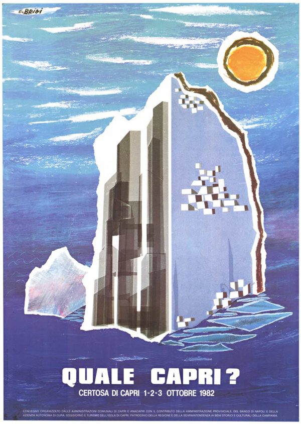 Issued in Italy during a period of increasing tourism pressure on coastal regions, the poster reflects contemporary debates around modernization versus conservation. Capri—long associated with imperial retreat, later with international leisure—becomes a case study for these tensions. Such explicitly conceptual travel posters are less common than straightforward promotional views.