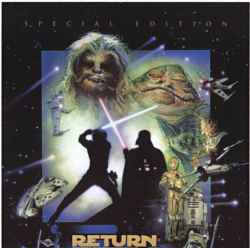 Description: Original 1997 Special Edition re-release U.S. one-sheet poster for Star Wars: Episode VI – Return of the Jedi, directed by Richard Marquand and produced by Lucasfilm Ltd., featuring iconic trilogy imagery including Luke Skywalker, Darth Vader, Princess Leia, Han Solo, and key elements of the Galactic conflict rendered in a montage-style composition against a starfield backdrop; issued to promote the theatrical re-release of the 1983 film, this example is single-sided and measures approximately 26.75 x 39.75 inches, consistent with the slightly variant dimensions of Special Edition printings; printed using commercial lithographic processes of the period, with printer not identified; not linen-backed, presented in fine condition with only light handling wear consistent with careful storage, retaining strong color and clarity.