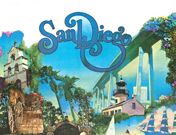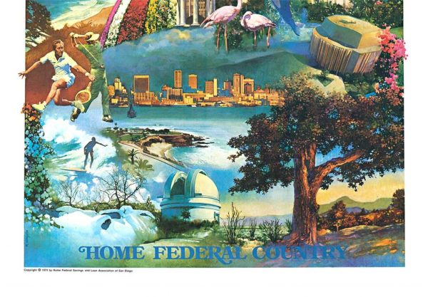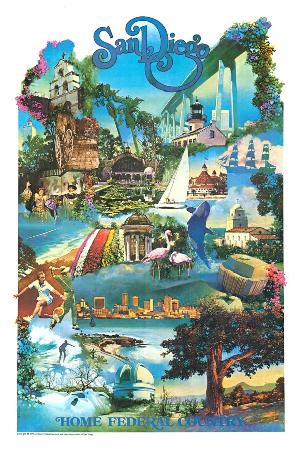 Original travel poster: San Diego (Home Federal), artist: Robert Kinyon, 24.25″ x 38″, 1974; original Southern California poster.