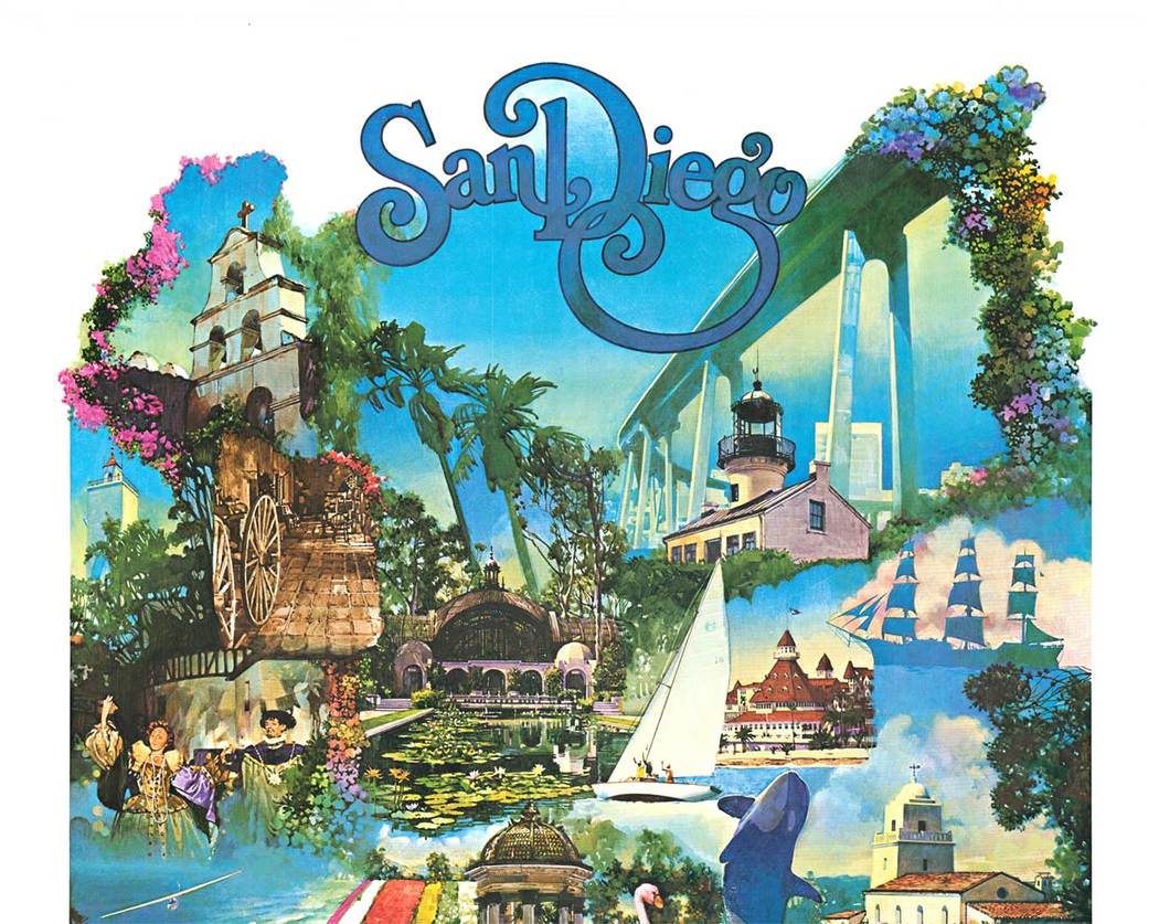 Original travel poster: San Diego (Home Federal), artist: Robert Kinyon, 24.25″ x 38″, 1974; original Southern California poster.