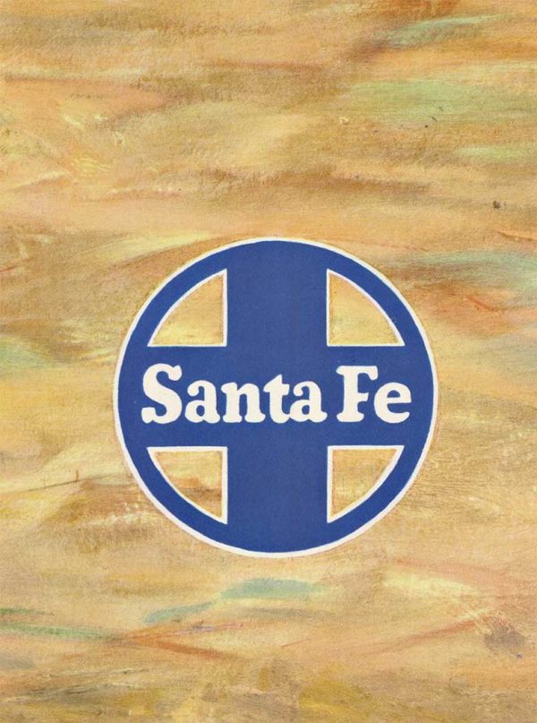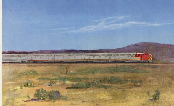 “Santa Fe ALL THE WAY” is an original Santa Fe railway poster (c. 1948). This great image features a little Indian boy writing “Santa Fe All The Way” in the desert sand. In the background you can see the train rushing along its path in the desert.