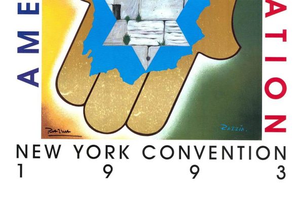 Original American Sephardi Federation New York Convention 1993, hand-signed, linen-backed vintage poster. Grade A- condition. Today, this poster is more challenging to locate because it was printed in a low number. According to my research, this is the last documented copy available.