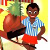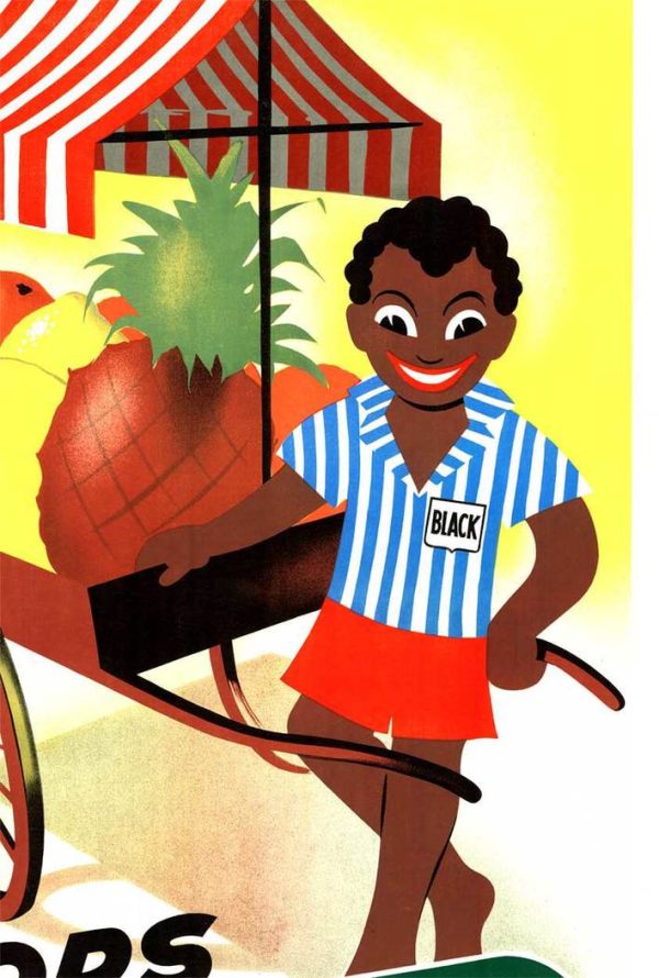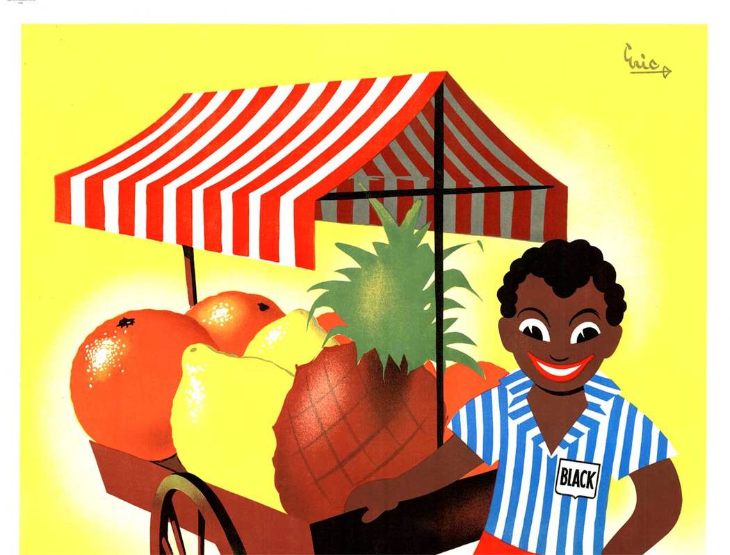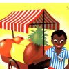 Watch how Eric orchestrates every element with masterful restraint. The vendor’s posture radiates pride and welcome; the fruit arrangement creates natural depth and movement. Bold red and green typography anchors the composition while the luminous yellow background makes every detail sing. The striped awning echoes the period’s love of graphic pattern and commercial energy. This is design intelligence made playful—clarity wrapped in genuine charm.