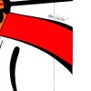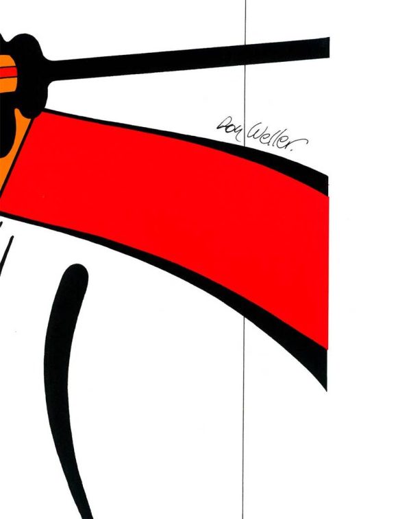 Original Western Airlines ski travel poster by Don Weller, created in the 1980s, featuring a highly stylized downhill skier rendered in bold, graphic form. The composition uses sharp linework and saturated red, black, and yellow against a minimal ground, capturing speed and motion with a distinctly modern, almost pop-inflected visual language.
