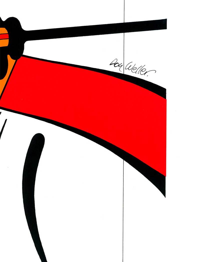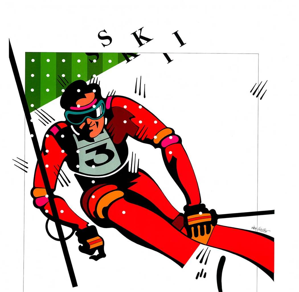 Original Western Airlines ski travel poster by Don Weller, created in the 1980s, featuring a highly stylized downhill skier rendered in bold, graphic form. The composition uses sharp linework and saturated red, black, and yellow against a minimal ground, capturing speed and motion with a distinctly modern, almost pop-inflected visual language.