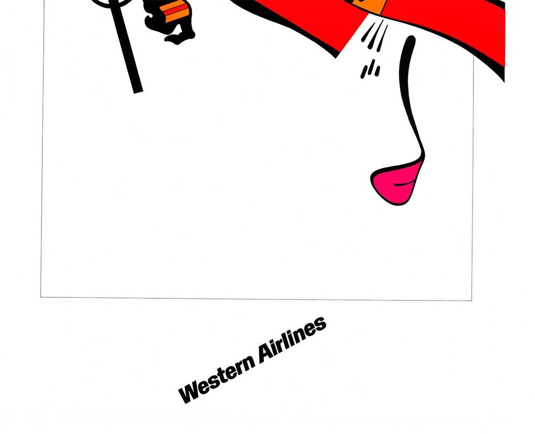 Authentic original lithograph poster issued by Western Airlines, not a reproduction. Sought after for its strong design, vibrant color, and association with both airline advertising and alpine sports culture, suitable for collectors and interior settings, including ski homes and modern design spaces.