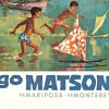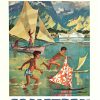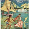 Discover the beauty of the South Pacific with this original Tahiti Matson Line vintage travel poster, a striking example of mid‑20th‑century cruise ship advertising. This authentic archival linen‑backed poster features children playing in the turquoise waters of Tahiti, traditional Polynesian sailboats, and a majestic Matson cruise liner set against dramatic island mountains. Advertising the Matson Line ships S.S. Mariposa and S.S. Monterey, the artwork captures the carefree tropical lifestyle and the golden age of luxury ocean travel.