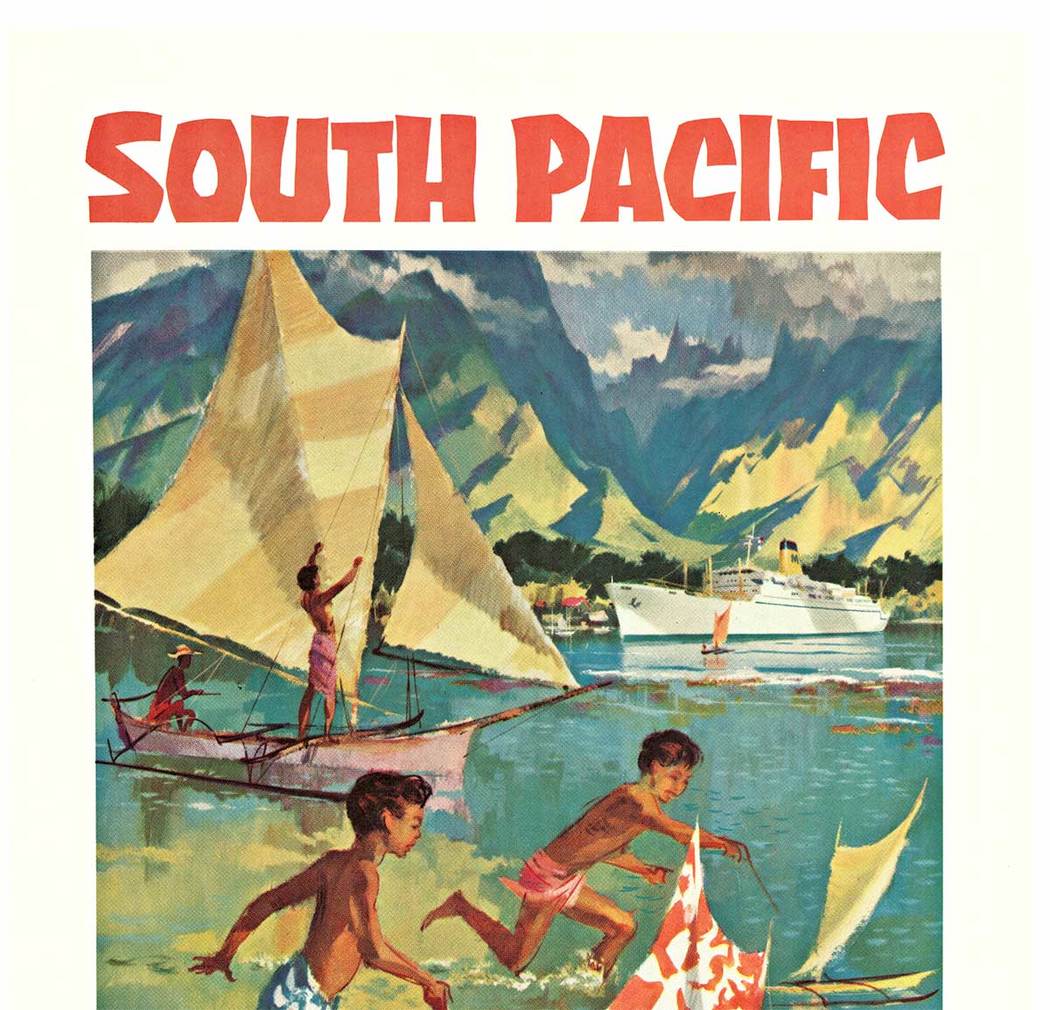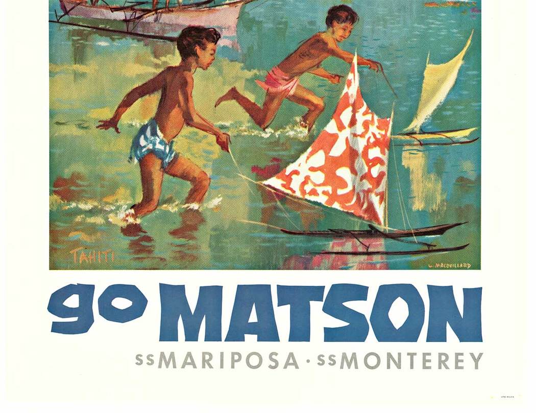 Discover the beauty of the South Pacific with this original Tahiti Matson Line vintage travel poster, a striking example of mid‑20th‑century cruise ship advertising. This authentic archival linen‑backed poster features children playing in the turquoise waters of Tahiti, traditional Polynesian sailboats, and a majestic Matson cruise liner set against dramatic island mountains. Advertising the Matson Line ships S.S. Mariposa and S.S. Monterey, the artwork captures the carefree tropical lifestyle and the golden age of luxury ocean travel.
