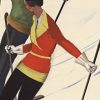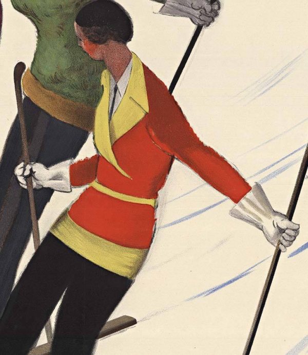 Cappiello distills the exhilaration of alpine sport into a crisp, forward-leaning composition of three skiers poised mid-descent above Luchon, Pyrénées. Their angular stances and vividly contrasted attire—rendered in a restrained Art Deco palette—create a sense of velocity against the clean sweep of snow. Commissioned by the Chemins de Fer du Midi, the image positions Superbagnères as a modern winter destination, easily reached by rail from Paris. The emphasis on contemporary dress and leisure culture reflects the interwar elevation of skiing as both sport and social ritual.