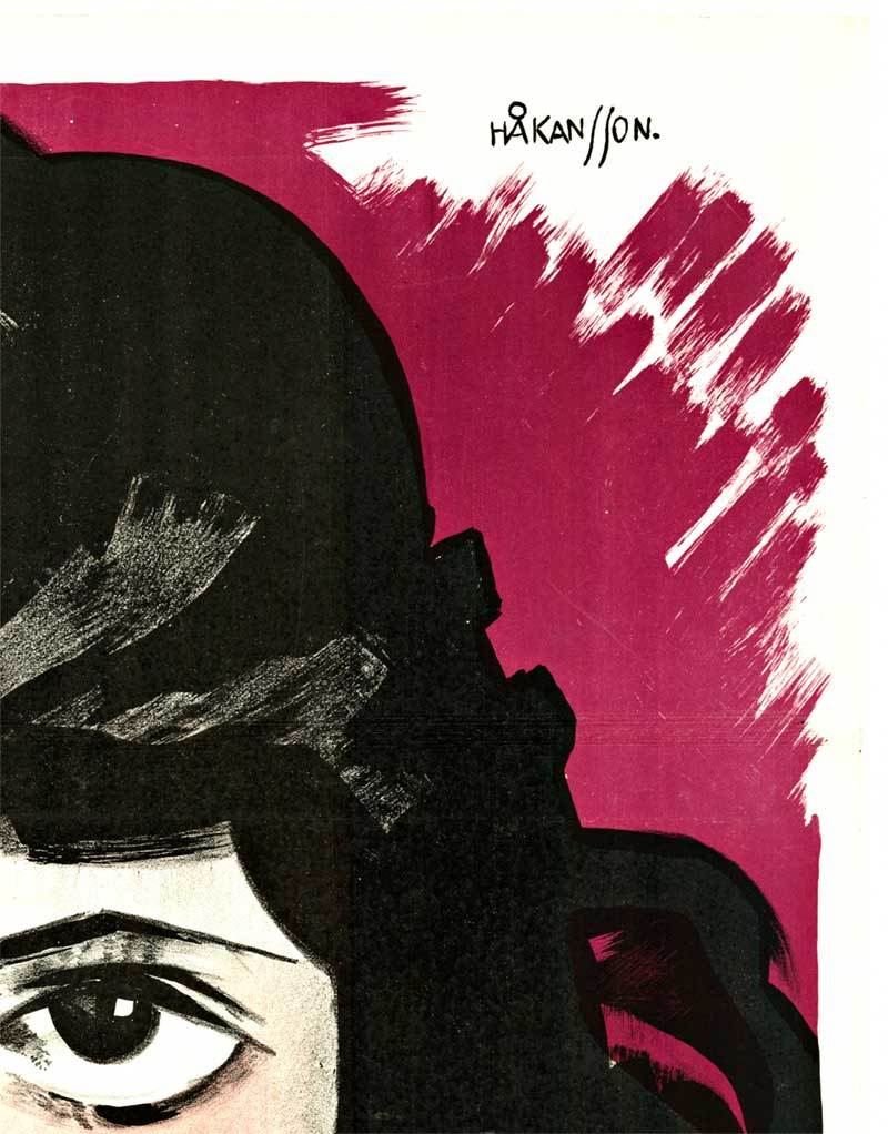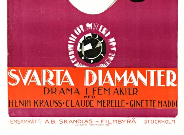 A striking example of early Scandinavian poster design, this original Swedish release for Svarta Diamanter (1922) captures the psychological intensity and stylistic refinement that defined silent-era cinema in the region. Gunner Håkansson’s composition is both arresting and modern: a stark, mask-like female visage dominates the frame, rendered with graphic simplicity yet heightened emotional charge. The exaggerated eyes and stylized features evoke both Expressionist influence and the emerging visual language of cinematic portraiture.