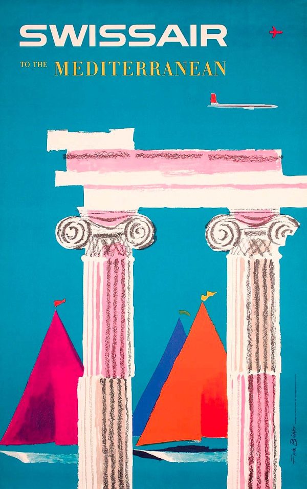 A modernist interpretation of Mediterranean travel, pairing classical architecture with bold, graphic color fields. Fragmented Ionic columns rise against a saturated blue ground, while stylized sails and a passing aircraft connect antiquity with the promise of mid-century air travel. The composition is deliberately spare, relying on contrast and geometry rather than detail. Issued by Swissair, it reflects the airline’s positioning of the Mediterranean as both cultured and effortlessly accessible.