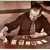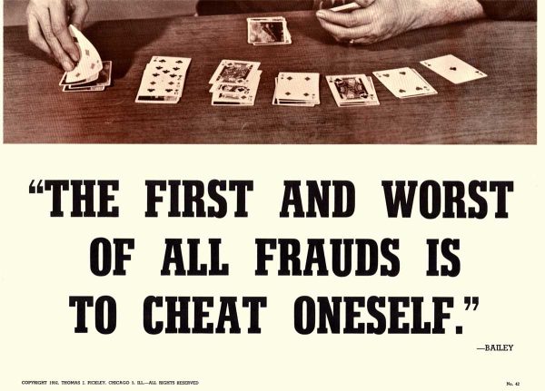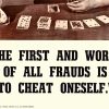 “The First and Worst of All Frauds is to Cheat Oneself” vintage 1952 motivational poster on linen (original print) ready to frame is a striking piece of mid-century motivational art. This original 1952 vintage poster features a poignant quote by American abolitionist and journalist Gamaliel Bailey: “The first and worst of all frauds is to cheat oneself.” The artwork depicts a man in a focused, contemplative game of cards—likely solitaire—rendered in a rich, atmospheric illustrative style typical of early 1950s American graphic design.