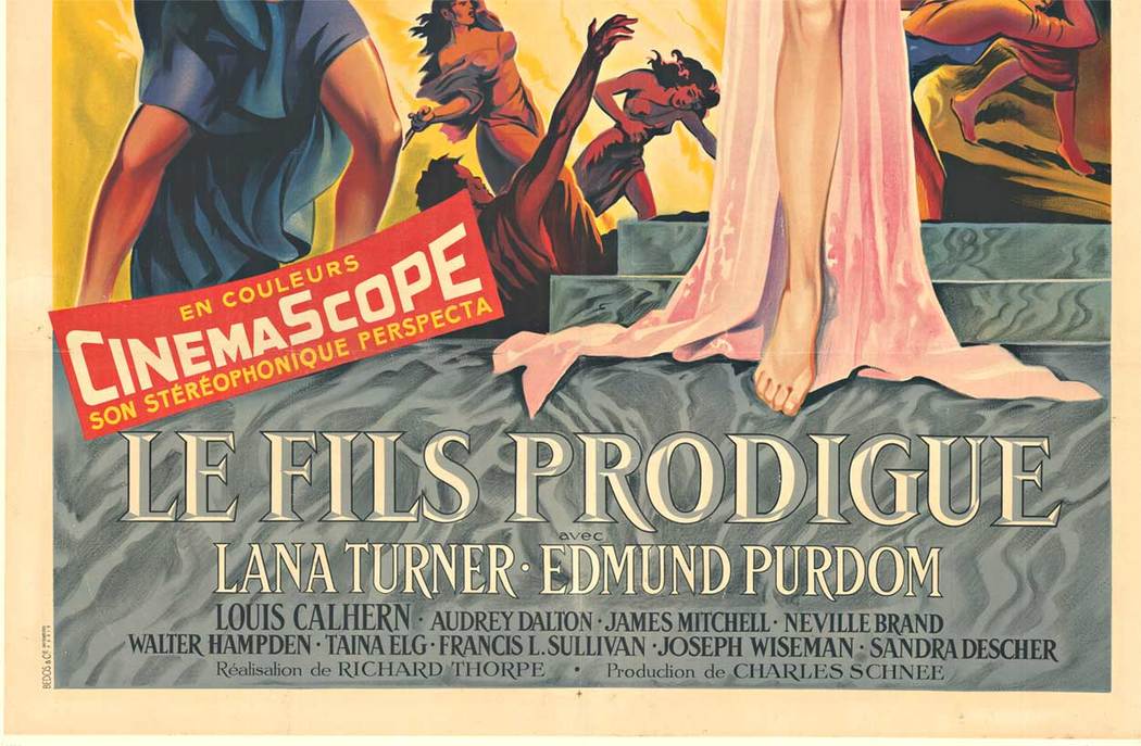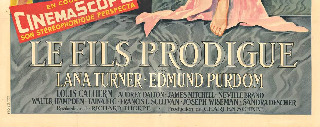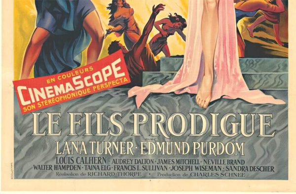 Original vintage French movie poster for The Prodigal Son (Le Fils Prodigue), starring Lana Turner, Edmund Purdom, Louis Calhern, Audrey Dalton, Neville Brand, and James Mitchell, directed by Richard Thorpe.