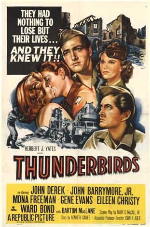 Thunderbirds is the 1952 WWII National Guard military airplane aviation pilot romantic melodrama, featuring the line: “They had nothing to lose but their lives… And they kew it!” The story is about an Oklahoma National Guard unit composed mostly of Native Americans.