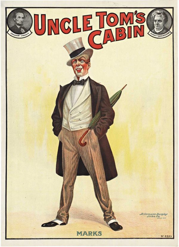 This poster is for the stage performance of Uncle Tom’s Cabin. The man depicted in the image is ‘Marks’ who was one of the slave clatters in this novel. Harriet Beecher Stowe’s 1852 anti-slavery novel “Uncle Tom’s Cabin; or, Life Among the Lowly,” By the beginning of the 20th century, more than 400 separate companies traveled and performed some theatrical version of the story.