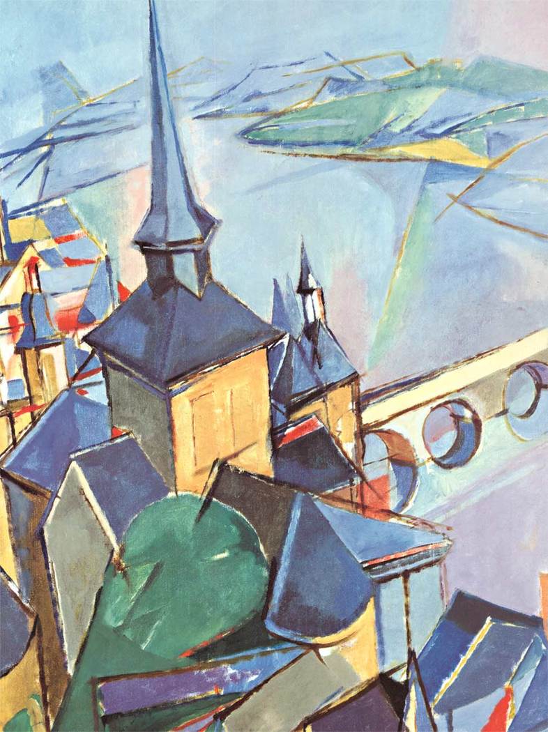 A painterly cubist interpretation of a French village, where rooftops and architectural forms are broken into angular planes of muted color. The composition balances structure and softness, using pastel tones to create depth while maintaining a distinctly modernist rhythm. The result is both architectural and atmospheric, offering a quiet, contemplative view of the landscape.