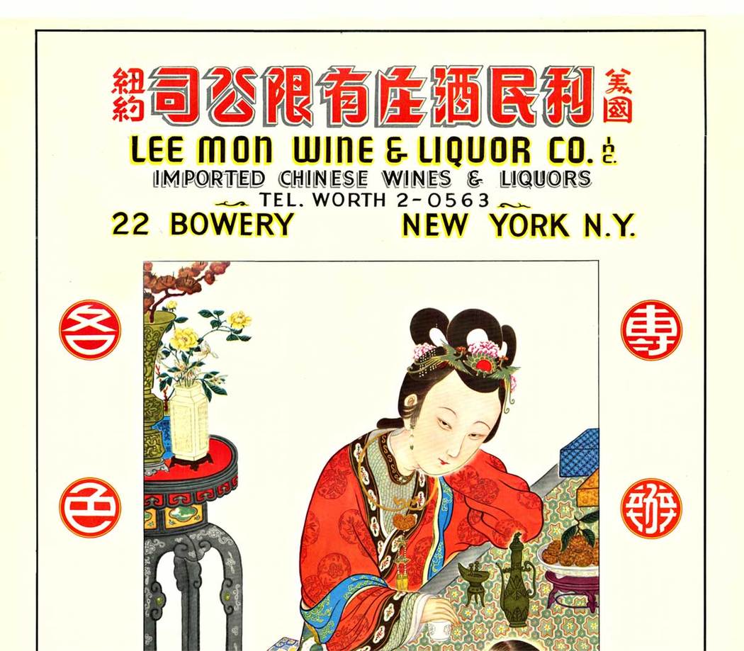 This extraordinary vintage Chinatown poster from 1938 represents a pivotal moment in American business history and Chinese-American cultural documentation. Lee Mon Wine & Liquor Co., founded in June 1937, was among the first established Chinese import businesses in New York’s historic Bowery district, and this 1938 Asian-American poster is one of the earliest known advertisements for the company—possibly the only surviving document of its original marketing materials.