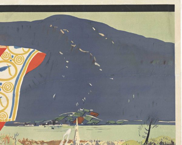 Condition & conservation: Fine. The poster was professionally linen‑backed on acid‑free linen and is ready to frame. A horizontal tear along the design was carefully repaired during the linen backing; there is minor wear to the 1/2″ outer cream border consistent with age. The lithograph surface shows attractive original color saturation with only minor handling wear; please review the supplied images for close detail.