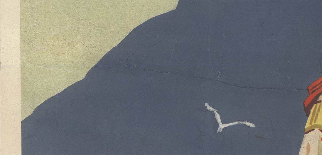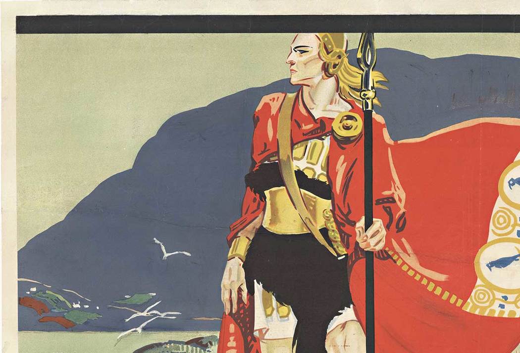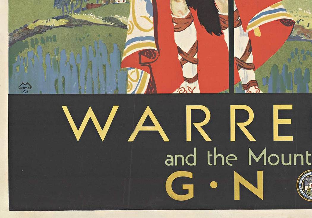 This rare 1931 stone lithograph promotes Warrenpoint and the Mourne Mountains for the Great Northern Railway (GNRI). Printed by J.B. Stephens, the poster features an arresting Art Deco warrior figure overlooking a sweeping coastal landscape — a dramatic, historic image that plays to local legend and landscape. The bold color palette, crisp typographic banding, and large-scale figure make this an outstanding example of early 20th-century Irish railway poster art.