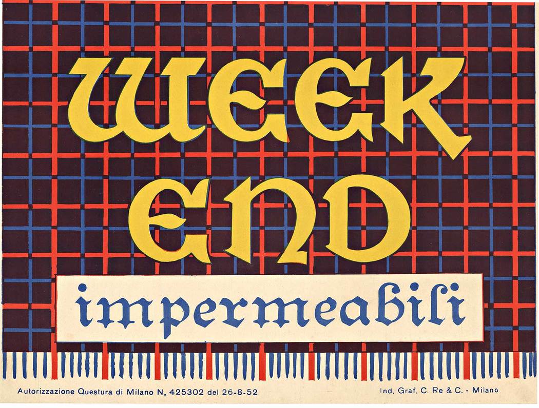 Original Week End Impermeabili Italian vintage fashion poster. Archival linen backed in fine condition, ready to frame. Grade A condition. Printed by Ind. Graf. C. Re & C. Milano, Italy. 1952.