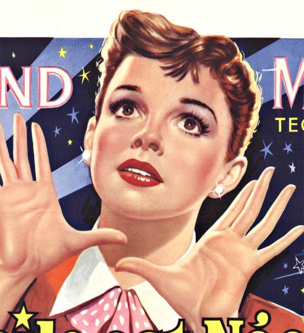 The poster itself is stunning. That bold yellow typography against the vibrant blue background, Garland’s expressive face commanding the upper third, and the supporting cast credits perfectly balanced—it’s exactly what made 1954 Belgian movie poster art so collectible today. The offset lithography technique gives it a depth and texture that digital reproductions simply can’t match.