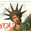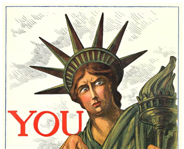 Delightful imagery of an angered Statue of Liberty sternly pointing in the “I Want You” fashion. Among the very earliest War Loan posters.