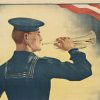The image is a World War I era recruitment poster for the United States Navy. It features a sailor in uniform blowing a bugle, with the American flag waving behind him. The poster’s text reads: “YOUR COUNTRY NEEDS YOU! JOIN THE NAVY NOW! FOR INFORMATION, APPLY TO THE RECRUITING STATION OR THE NAVY LEAGUE.” The poster uses bold colors and a dramatic pose to encourage people to join the Navy.