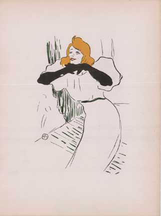 Lautrec’s treatment reflects his deep familiarity with Guilbert’s stage presence—restrained, precise, and subtly expressive. Rather than relying on elaborate detail, he conveys atmosphere through suggestion: a few gestural lines indicate the setting, while the figure’s posture and expression carry the composition. This approach exemplifies his ability to distill personality into minimal yet powerful visual language.