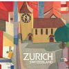 The composition draws the viewer into the city from above, guiding the eye along curved streets surrounded by colorful buildings and lush greenery. Wolff’s distinctive use of simplified shapes and balanced color creates a timeless visual narrative that reflects both Zurich’s historic past and its modern spirit.